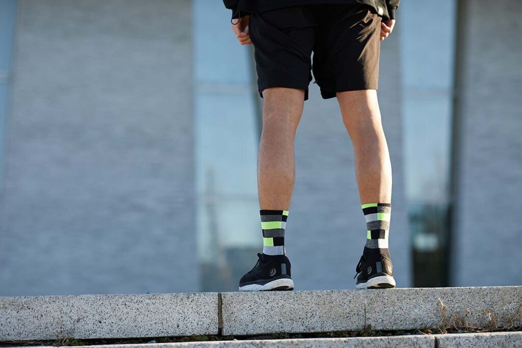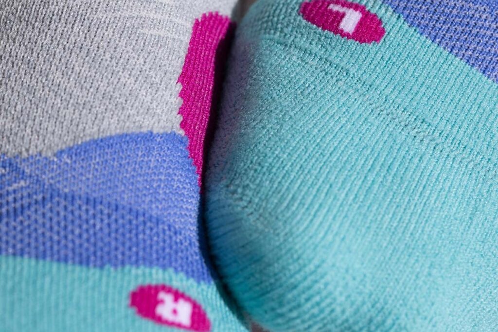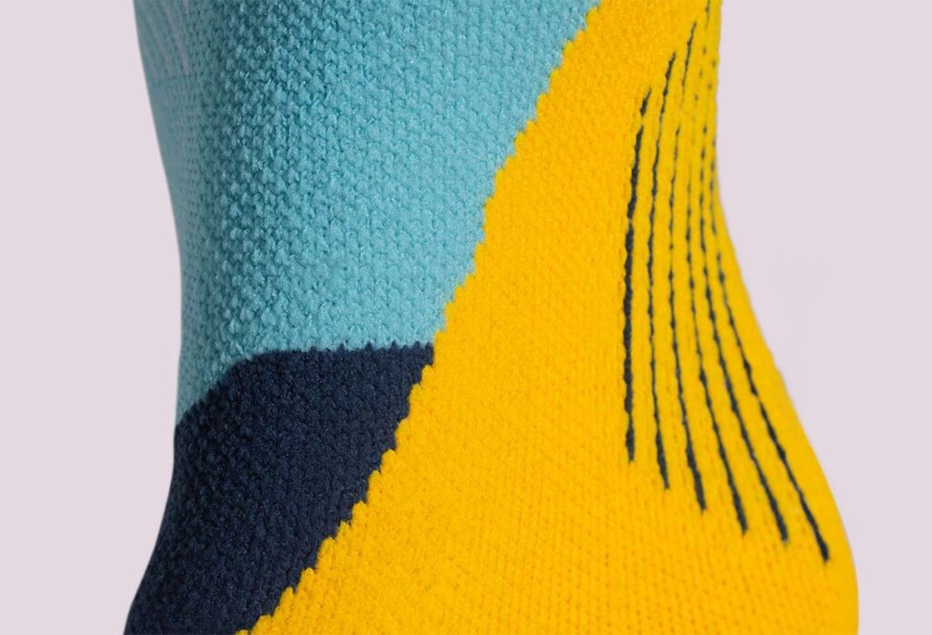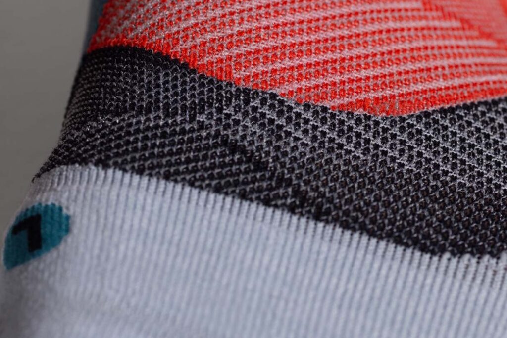 続いては、ソックスの厚み。これもランナーの動作に応じて快適性が担保されるように考慮されている。甲部分は速乾性に優れたナイロン糸、つま先部分はゴワつきを感じないシームレス仕様。カカト部はズレを防止する立体構造ときめ細かいつくり。