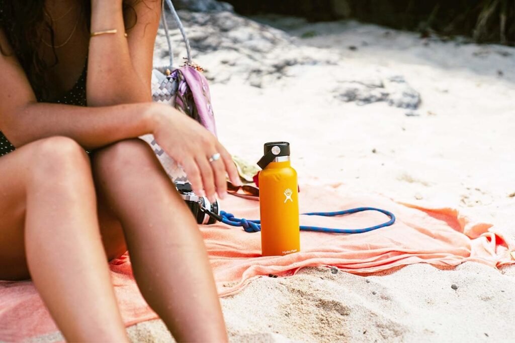 彼女のライフスタイルに欠かせないのはビーチだ。浜辺で涼む彼女の隣にはいつもハイドロフラスクがある。