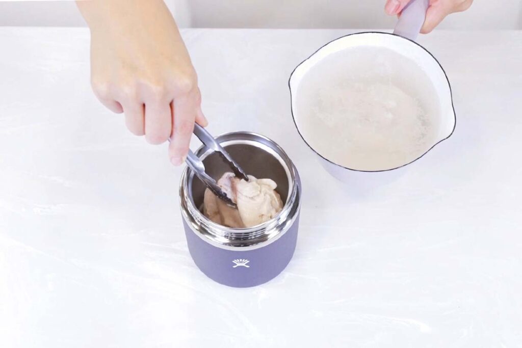 5.気泡が湧いたらすぐに、鶏肉と茹で汁をFood Jarに移し、ごま油を入れ、蓋をしっかり閉める。