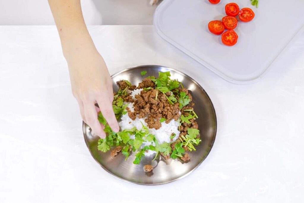 4.お皿の上にご飯を盛り、ひき肉、卵、パクチー、目玉焼き、マヨネーズ、トマトを飾りパルメザンチーズをかける。