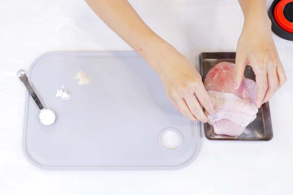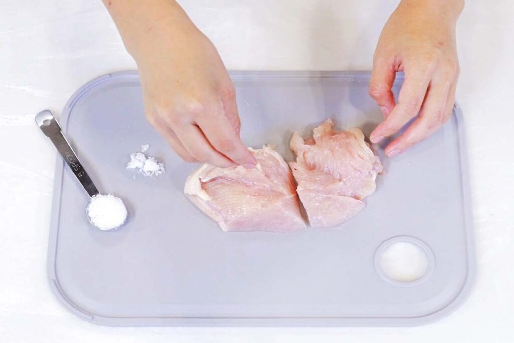 2. 鶏胸肉の表面に砂糖ひとつまみを塗り込み3分ほど放置。表面の砂糖が溶けたら、塩をひとつまみ刷り込む。こちらも3分ほど放置。