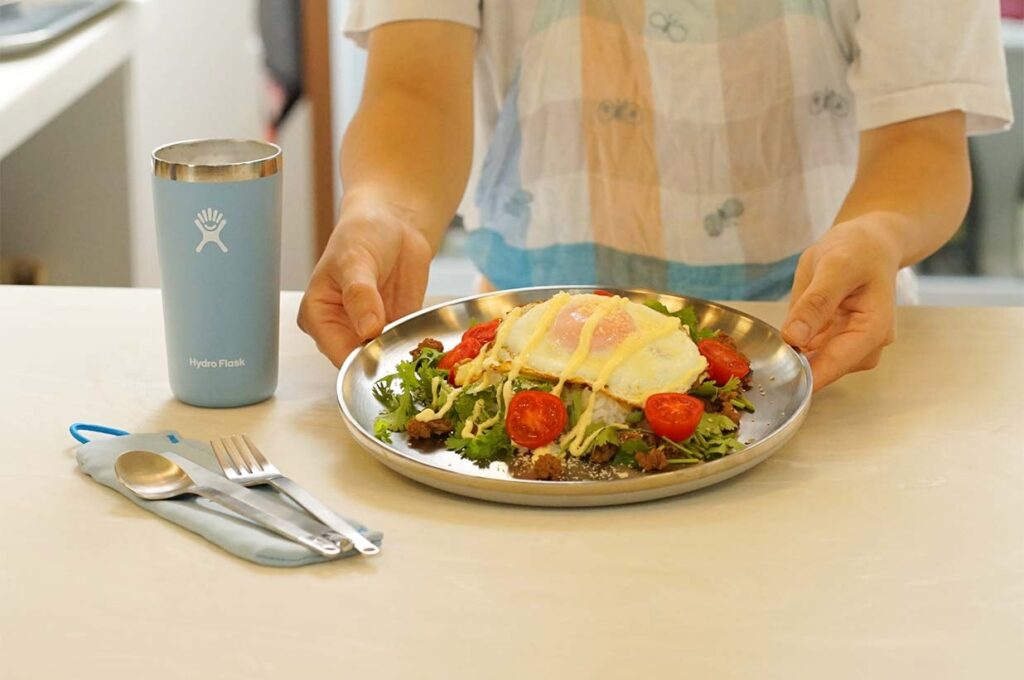 Hydro Flaskの「10in Plate」は、温度を長時間キープし熱が外に伝わらない構造なので、タコライスのようなワンプレート料理にもぴったり。18/8 プログレードのステンレス製のフォーク、ナイフ、スプーンがセットになった「Flatware Set」は耐久性、耐腐食性に優れておりお手入れも簡単。さらに「12oz All Around Tumbler」も一緒に食卓へ。好みの飲み物を長時間適温で楽しむことができる。
