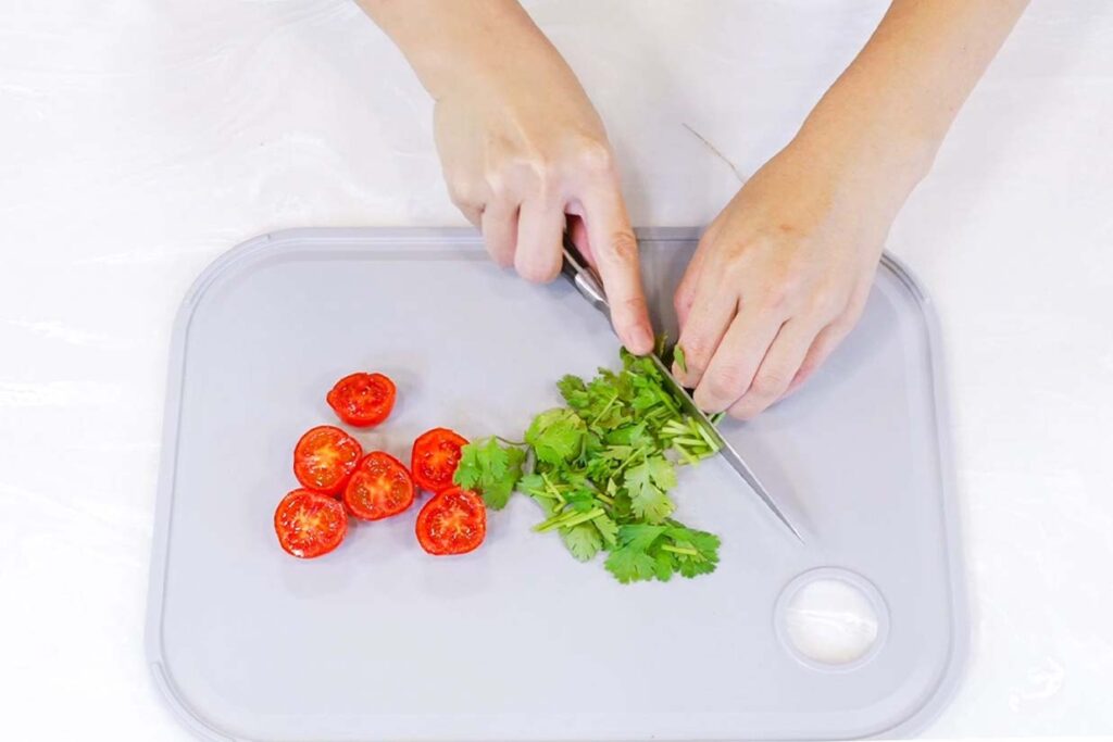 2.トマトを半分に、パクチーをざく切りにする。合い挽き肉にトマトケチャプ、ウスターソース、自家製メキシカンミックスを揉み込む。