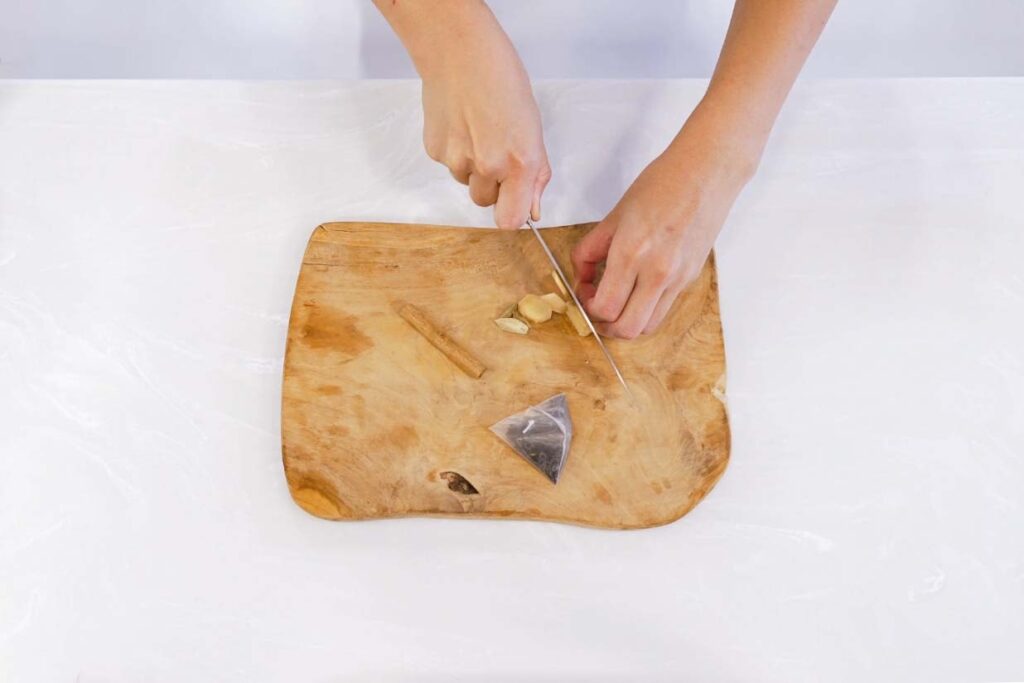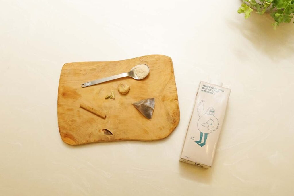 1.生姜をスライスし、カルダモンの外皮を割る。シナモンスティックを折る。