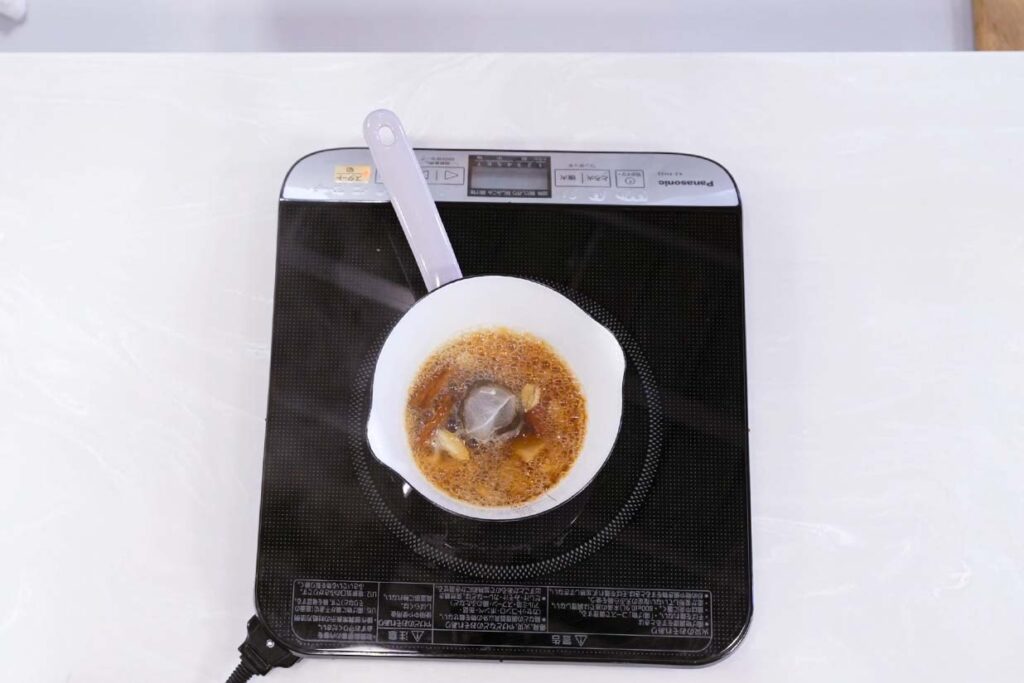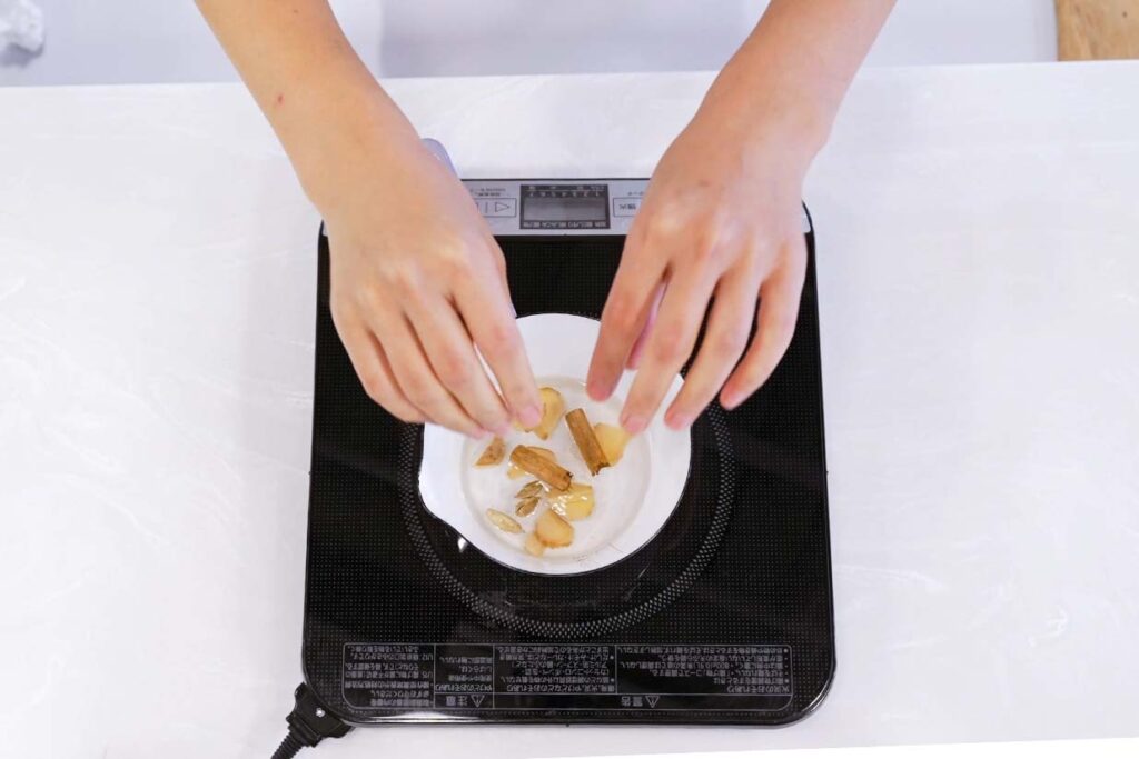 2.小鍋に100ccの水を入れ、生姜、カルダモン、シナモンスティックを入れて火にかける。スパイスの香りを水に移す。