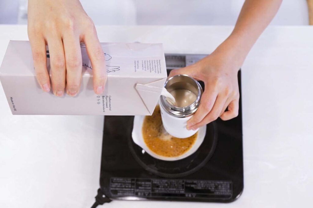 4.12oz Wide Mouthボトルの凹み部分までのオーツミルクを鍋に注ぎ入れ、しばらく火にかけ、(煮こぼれる直前に鍋を火から離す、を5-6回繰り返す)砂糖を入れる。
