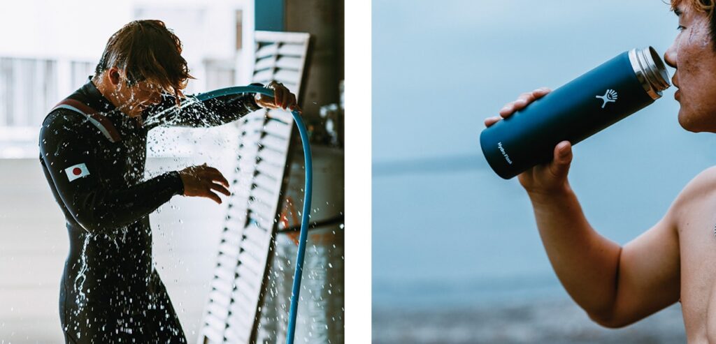 「ハイドロフラスクは以前から知っていました。ハワイに行ったとき、現地でとても流行っていて。自分はいつも水を入れています。氷を入れるといつまでも冷たくて……この時季、ビーチはめちゃくちゃ暑いので本当にありがたいんですよ」