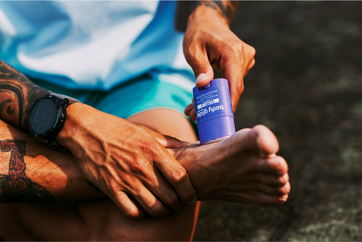 そしてソックス、シューズ以外にも、実はマメを作らないための秘密のアイテムがあります。それがカリフォルニア発の皮ふ保護バーム、Body Glide®。南さんは、足用の「Foot Glide®(フットグライド)」をおもに使用しているとのこと。