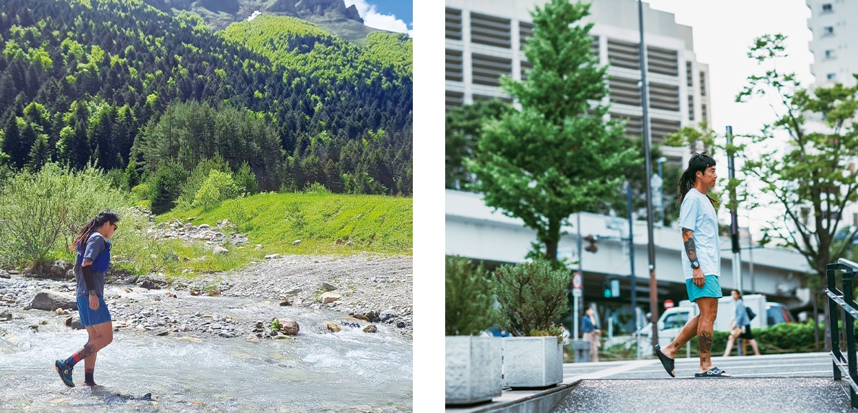 左右で違う色を履いているのは、決して間違いやトラブルではない。それが南圭介さんのスタイルなのです。愛用しているのはTopo Athleticの「ULTRAVENTURE 3」。ウィメンズモデルが足に合うそうです。