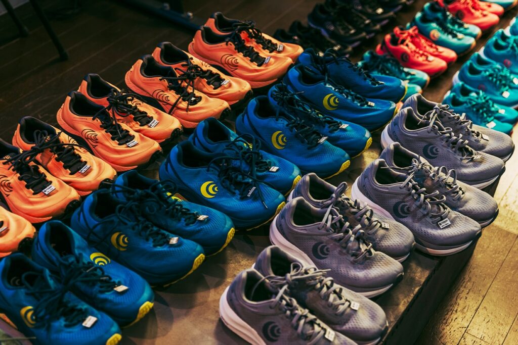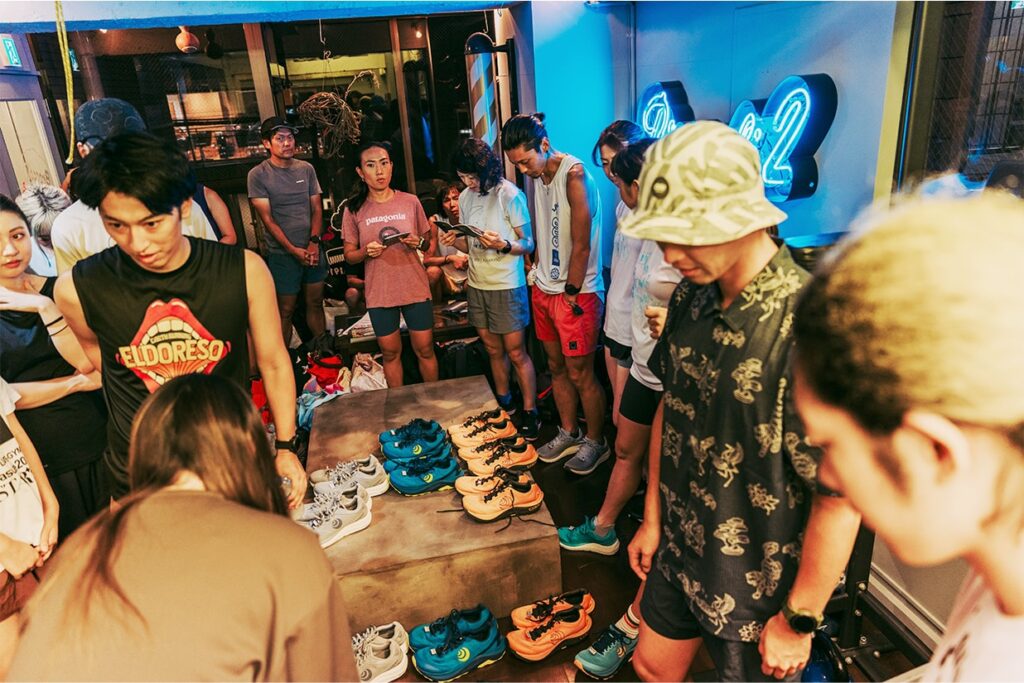 今回のグループランは、Topo Athleticの試着会も兼ねています。トレイルランニング用の新作「MTN RACER 3」と人気の「ULTRAVENTURE 3」、ロード用の新作「PHANTOM 3」を各サイズ用意。すでにTopo Athleticを履いたことがあるという人も、そうでない人も、多くの人が試着してくれました。