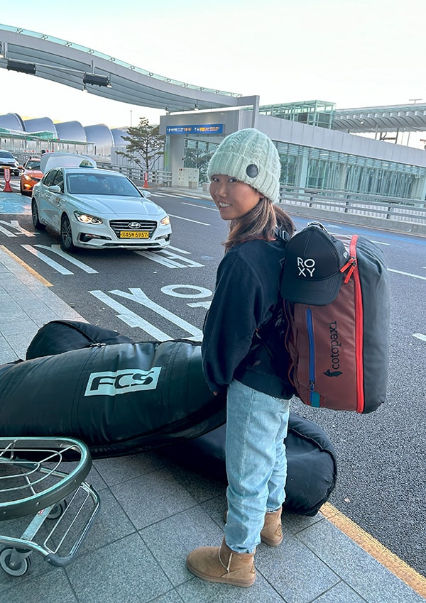 「遠征での大荷物はボードケースですから、ほかの荷物は極力コンパクトにしたいんです。割と短期間の遠征は、このCotopaxiのALLPA 50L 1つでこなせちゃいます。フィリピン、台湾、韓国と3カ国を巡るツアーもこのダッフルバッグだけで回りました。チームメンバーは『荷物、これだけ?』って驚いてましたが(笑)」