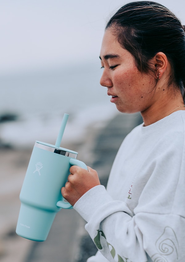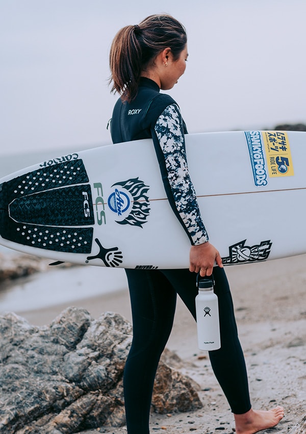 「宿泊先から大会会場まで距離がある時は軽量なスリムボトル、ビーチが近かったり、暑い国ではたっぷりサイズを使っています。そうそう、最近手にしたハンドルとストローが付いているニューモデルは、遠征先での車移動時にスムージーを入れて飲もうと思っています」