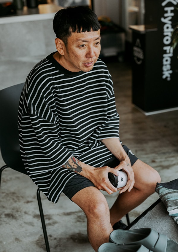 ベランダに出て植物に水やりする時、近所にある行きつけの店に赴く際につっかけるのがOOFOS®のサンダル『OOahh-Olive Drab』。「履き心地の良さに“ぶったまげた”というのが正直なところです。まったく足が疲れなくて、いいですね」Hydro Flask®のボトルは、冬のサーフ時に頻繁に登場。「朝、温かいコーヒーを入れて道中と海で楽しんでいます。ボトルはいっぱい持っているのに気が付くと使っているのはHydro Flask®の白い『12 oz Flex Sip』ばかり。温かいコーヒーをちょっとずつ飲むので、このサイズ感がちょうど良いんです」