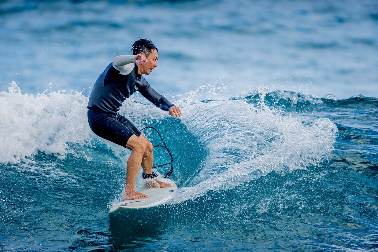 30代後半、懇意にしているカメラマンに誘われたりサーフィン雑誌『Blue.』で連載を受け持ったことから、再び海との関係が繋がり週に1~2回、波乗りを楽しんでいるそう。