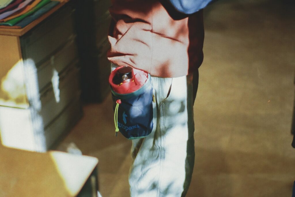 A.「Halcon Chalk Bag」(写真2枚目)は人気アイテムであり、個人的も気に入っています。アイテム名の通り、クライミングでのチョーク(滑り止め)を入れるバッグですが、ちょっとした小物を入れるウエストバッグとしても使えます。ワンちゃんのお散歩に欠かせないペットボトルを入れるにもいいサイズ感とお買い求めになる方もいるんですよ。